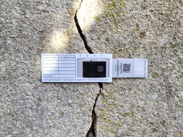 Conseils de posesAfin de mesurer le plus efficacement possible l’évolution de la fissure, la jauge est souvent fixée au niveau où la fissure est la plus large (généralement au milieu de la fissure). La jauge se fixe quelque soit le sens de la fissure (fissure verticale, horizontale, oblique), à cheval sur la fissure pour mesurer l’évolution de son écartement.