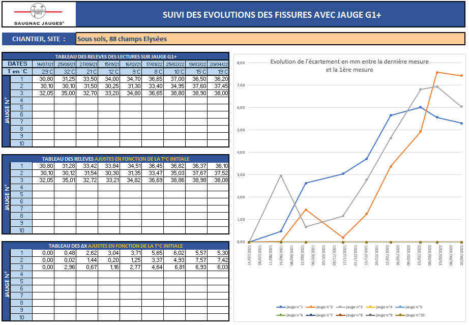 Ce fichier Excel est très simple d’utilisation : il suffit de dupliquer une feuille pour chaque site ou chantier observé avec la possibilité de suivre jusqu’à 10 jauges. Ce fichier tient compte du coefficient de dilatation du corps de la jauge et du bras mobile en ajustant chaque mesure relevée avec la température par rapport à la température initiale de la 1ère mesure. Si vous n’avez pas relevé la température, il suffit de ne pas l’indiquer pour que le coefficient de dilatation ne soit pas pris en compte. A noter que l’impact du coefficient de dilatation sur la mesure de la G1+ est très faible (environ 9 micromètres tous les 1°C).